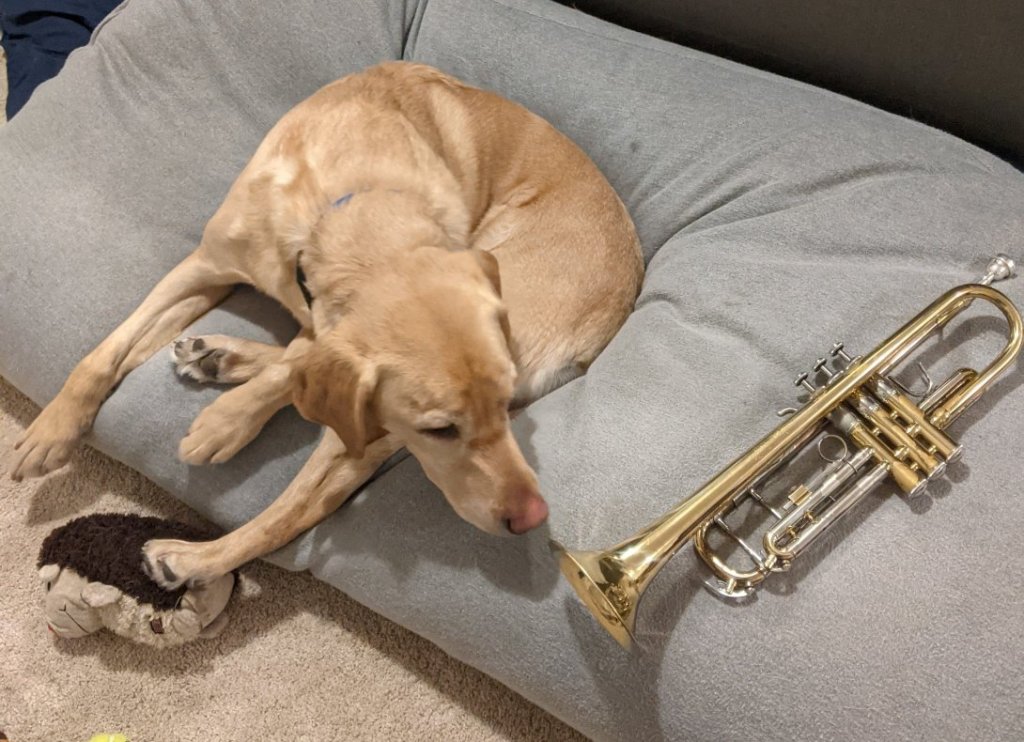 So I bought a trumpet a few weeks ago, and it’s just as hard to play as I imagined. I am slowly moving along, playing it for a few minutes mostly every day, trying to get some clear notes. Curious to see what jazz tune I can find to start off with, once I get to that stage. Lots in B flat to chose from though.